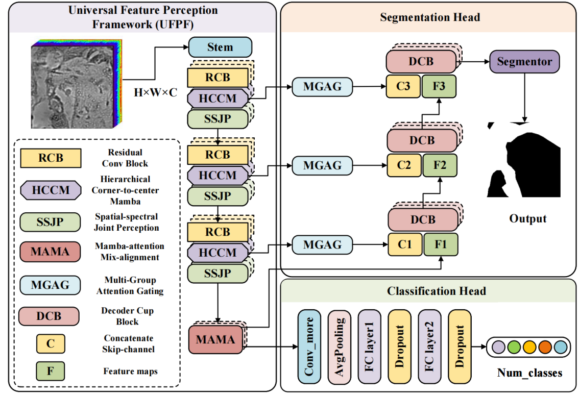 针对上述问题,研究团队提出了一种微观高光谱通用特征感知框架(UFPF),如图1所示。该框架能够高效提取高光谱数据的高质量空间-光谱特征,为下游任务提供稳健的特征基础。具体而言,这一创新框架通过分层的角点-中心曼巴结构(HCCM)捕捉不同的顺序空间最近邻关系,采用“渐进式中心聚焦”概念,从边缘信息开始强调,逐步将注意力从边缘向中心精炼,实现对复杂病理结构的全方位特征捕捉。在此基础上,开发了双路径空间-光谱联合感知模块(SSJM),通过互补机制充分挖掘空间与光谱信息中的潜在模式;同时设计曼巴-注意力混合对齐机制(MAMA),增强深度语义特征的优化对齐效果,进一步提升特征的判别能力。