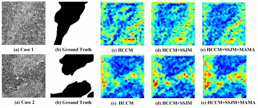 图2展示了不同模块对病理癌区检测特征提取关注度的可解释性结果。可见HCCM初步捕捉癌组织区域特征,但存在响应模糊问题;融入SSJM后,空间-光谱信息协同增强,肿瘤与正常组织的特征区分度提升;再结合MAMA,深度语义对齐优化,特征关注度更精准聚焦病理癌区边界与核心区域,验证了多模块协同对高光谱脑病理癌区特征提取的增益,从可视化角度解释了模型架构的有效性。